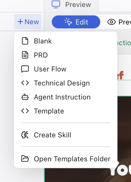 Click + New at the top of the Documents panel to create a document. You can start from a blank file or choose a built-in template: PRD, User Flow, Technical Design, or Agent Instruction. Each template provides a structured starting point so you don't have to write from scratch.