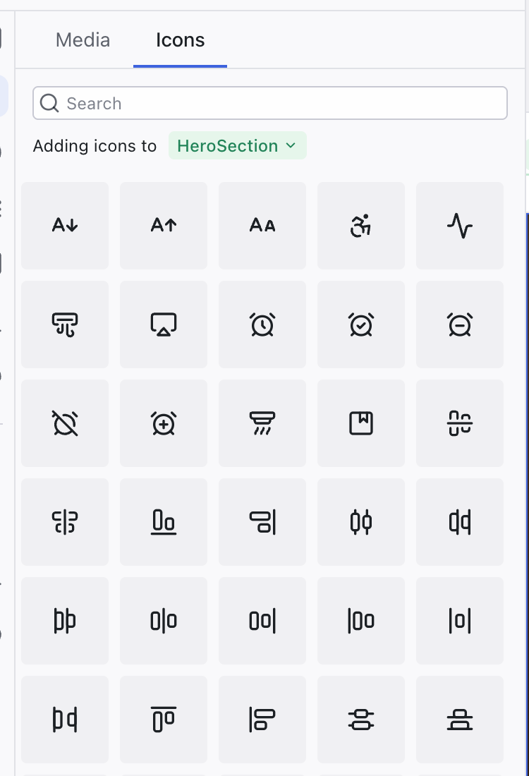 The Icons tab lets you browse and search icons. Select an icon or drag it onto the preview to add it to a component.