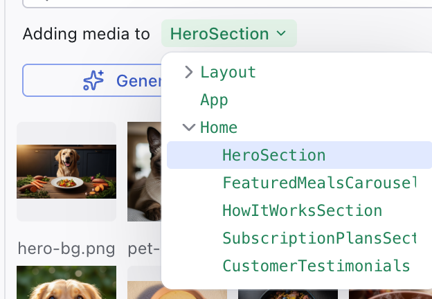 - Adding media to — a scope selector showing which component new media will be added to. Click to choose a different component on the current page.
