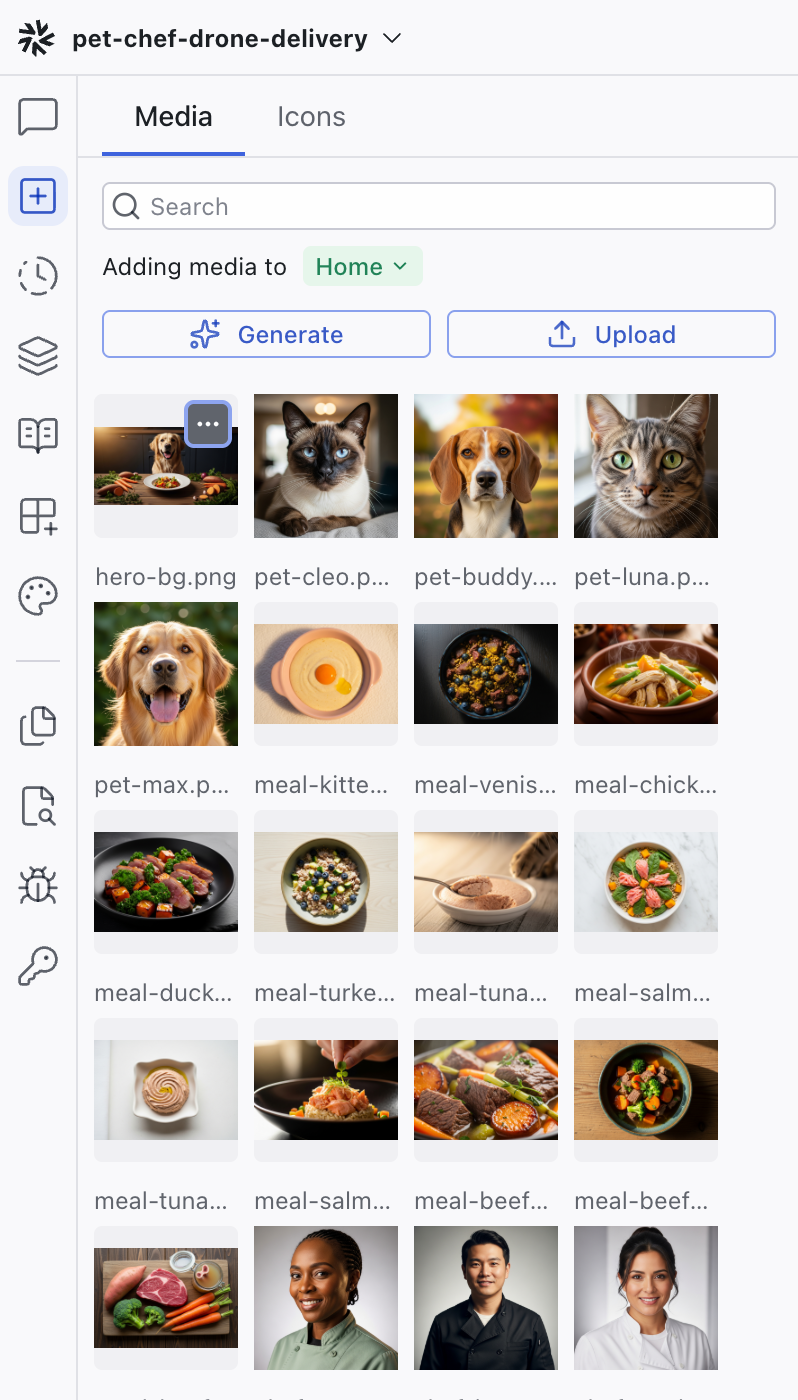 The Add Panel is a sidebar tab that shows all media files in your project — images, icons, and other visual assets. Use it to browse what's in your project, upload new files, generate images with AI, and attach media to chat conversations as context.