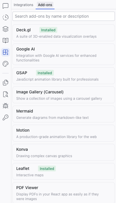 Add-ons are pre-built recipes that help install and configure libraries in your project. They live in the Add-ons tab within the Integrations panel, and handle the initial setup steps (installing packages, creating configuration files, adding boilerplate) so you can start using a library without deep technical knowledge.