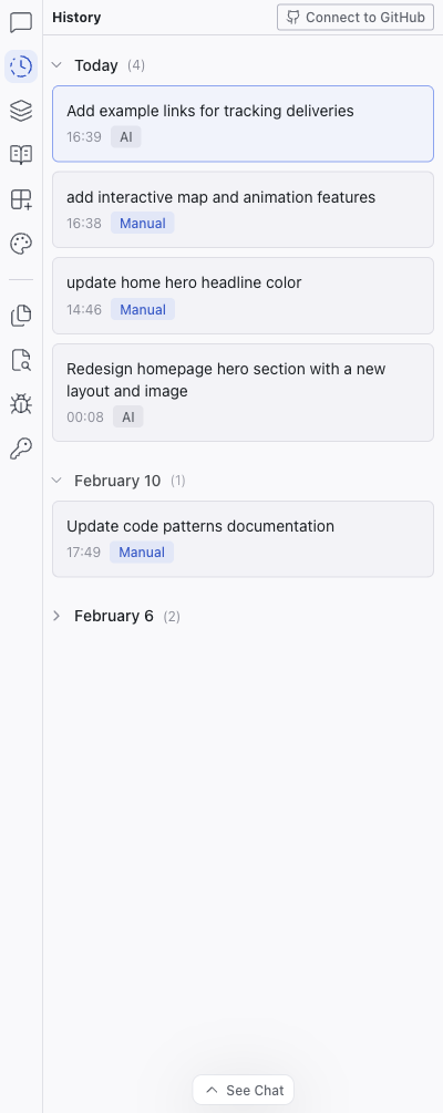 When you switch to another sidebar panel (History, Elements, Specs, etc.), the Chat panel stays available as a collapsible overlay at the bottom of the sidebar. This lets you keep your conversation visible while working in other panels.