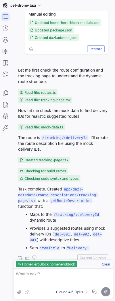 Use it to brainstorm features, plan an approach, or ask the AI about how your project works — why a component behaves a certain way, what a piece of code does, or how things are connected. Toggle it off when you're ready for the AI to start making changes again.