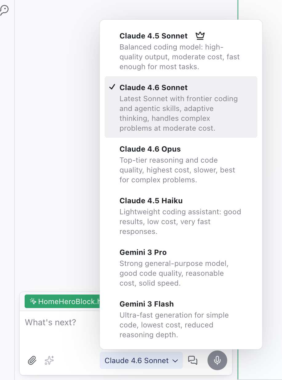 Each model consumes credits at a different rate. The token cost of each AI response is displayed next to the model icon. Lighter models (Haiku, Flash) consume fewer credits per interaction than heavier models (Opus). Visual editing, inspecting, and browsing your project don't consume credits — only AI-generated changes do.