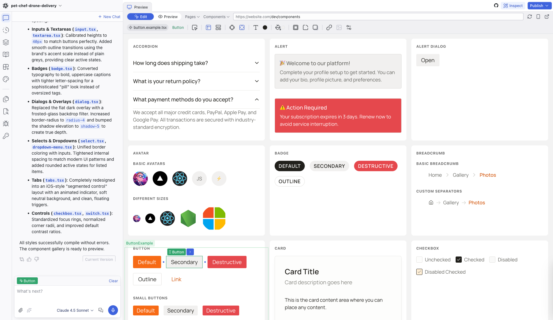 You can also use the Chat panel to make broader changes — for example, asking the AI to update all buttons to use a new border radius or to restyle your card components.