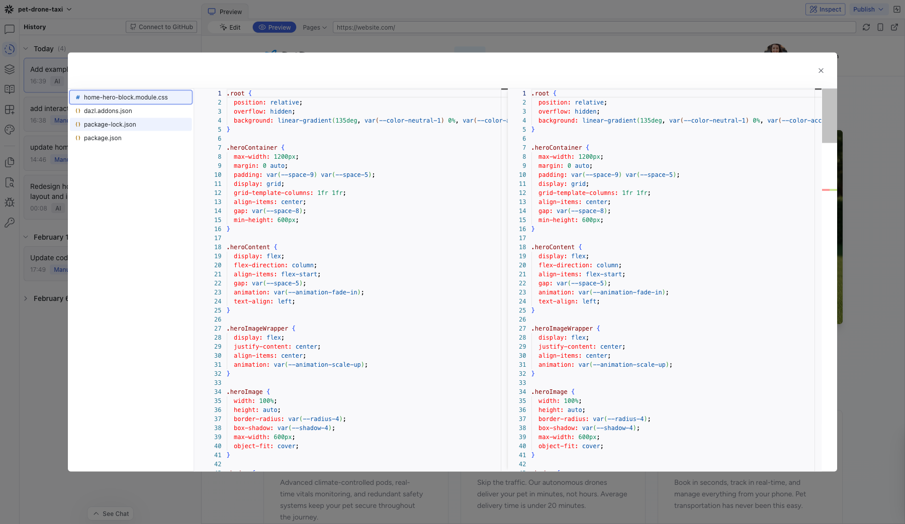The History panel shows a timeline of every change made to your project, with the ability to view diffs and restore previous versions.