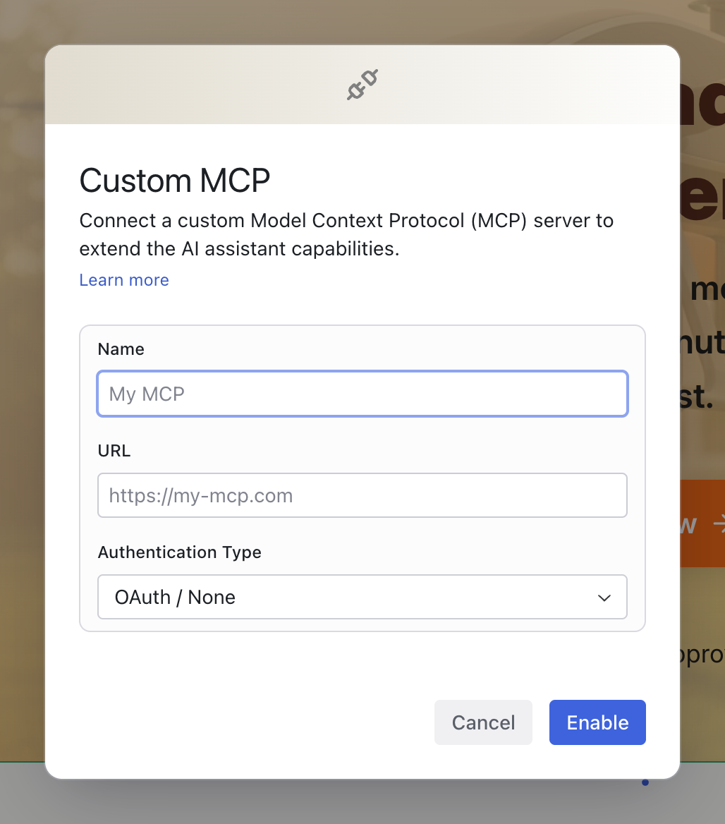 Click Add Custom MCP at the bottom of the Integrations list to connect your own MCP server or a third-party MCP service.