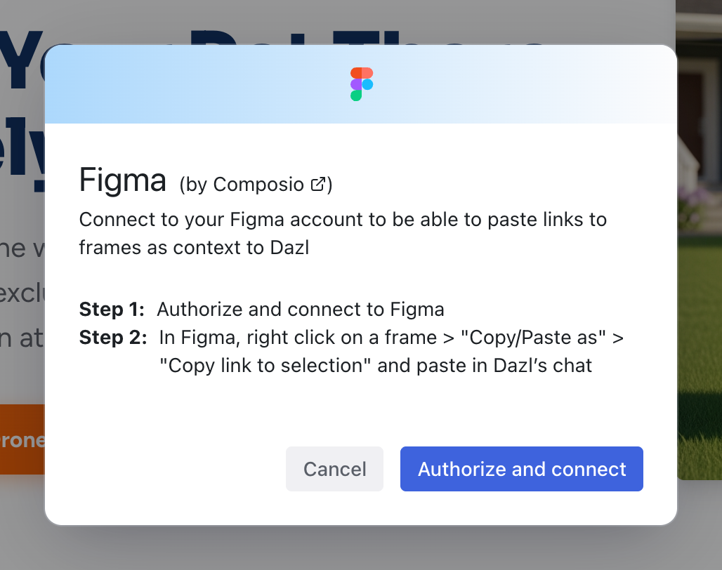 Import frames and designs from Figma directly into Dazl. The AI uses the design as a reference to generate working code that matches your layout and styling.