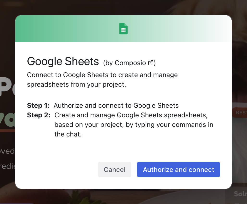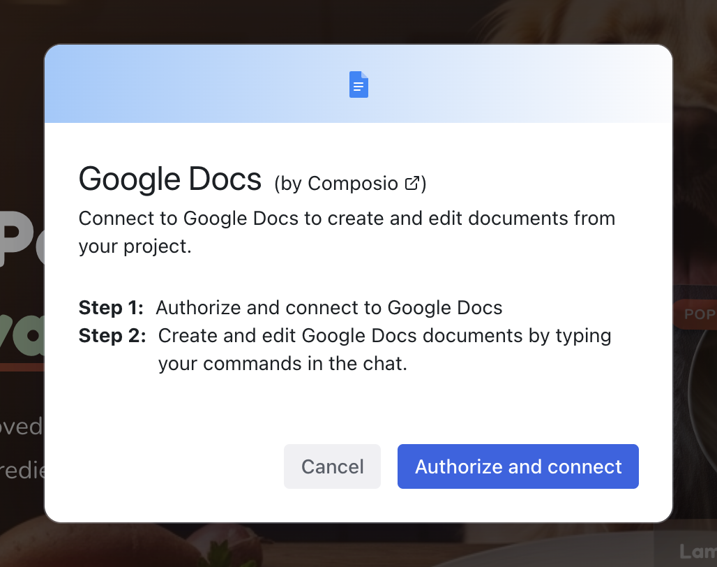 Connect a Google Docs account to pull in document content as reference or create new documents from your project's content. For example, feed a PRD into the chat so the AI builds to spec, import landing page copy from a shared doc, or generate a handoff document describing what was built.