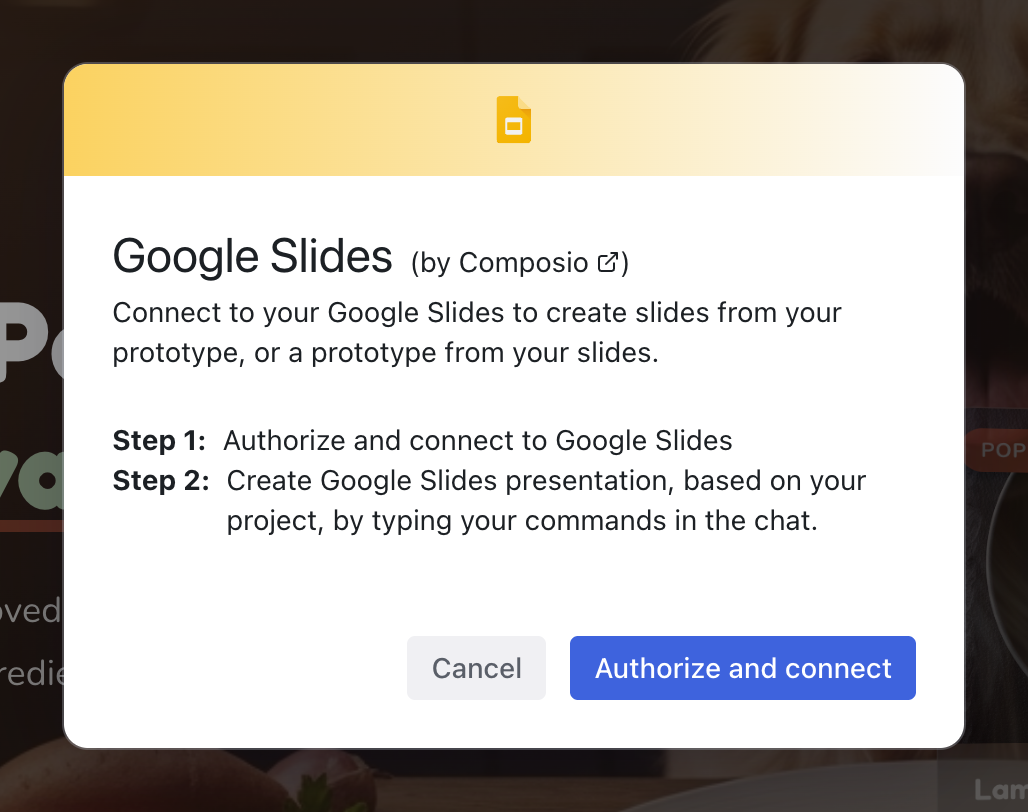 Connect a Google Slides account to reference presentation content or create new slides from your project. For example, reference a pitch deck for design direction, or generate a stakeholder update with screenshots and descriptions of what you've built.