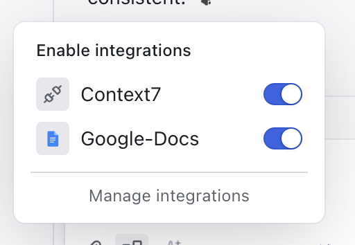 You can enable or disable integrations without leaving the Chat panel. Click the MCP toggles button in the prompt box to open a popover listing all connected servers with on/off switches.