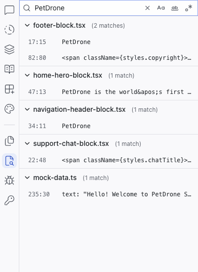 The Search panel lets you search for text across all files in your project. Type a query in the search box and results appear instantly, grouped by file.