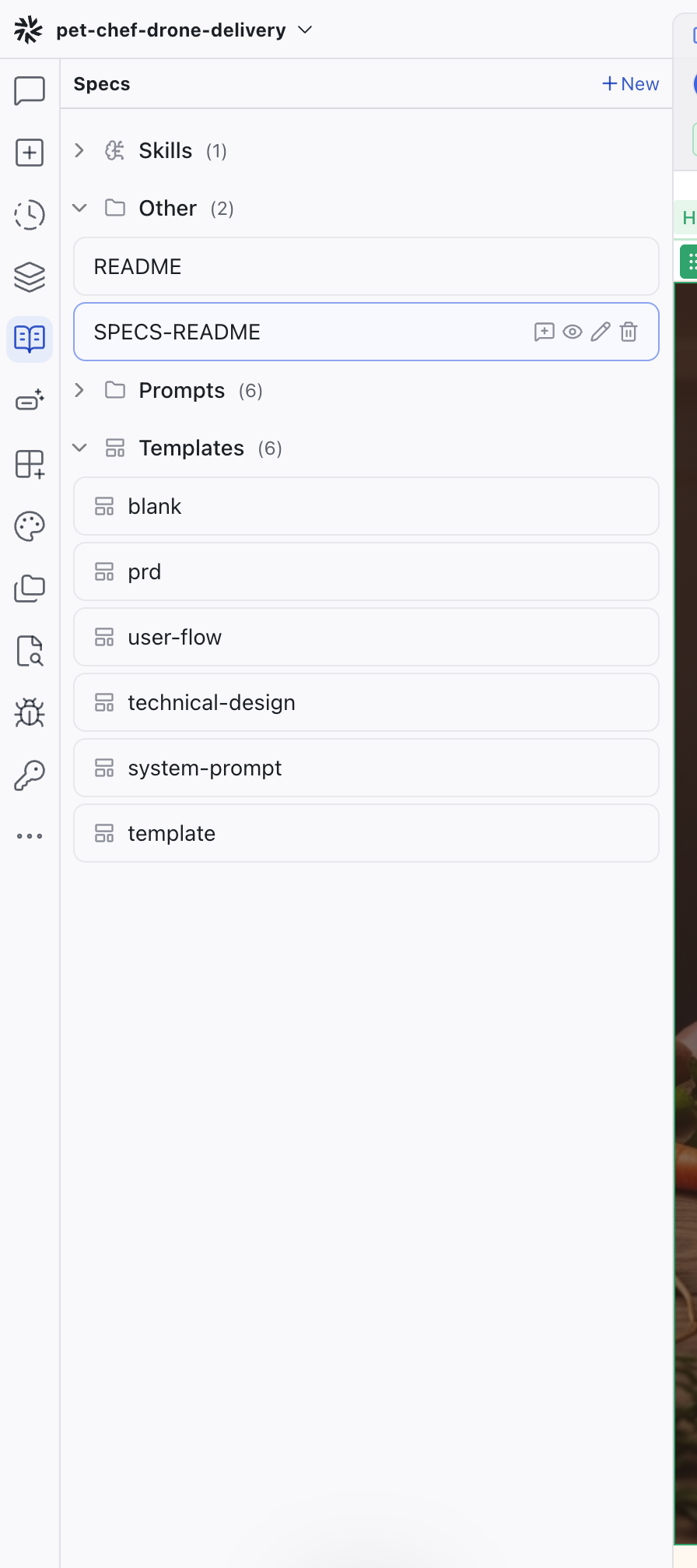 Click + New to create a spec from a blank file or a built-in template (PRD, User Flow, Technical Design, Agent Instruction). You can also create a custom template or a skill from the same menu.