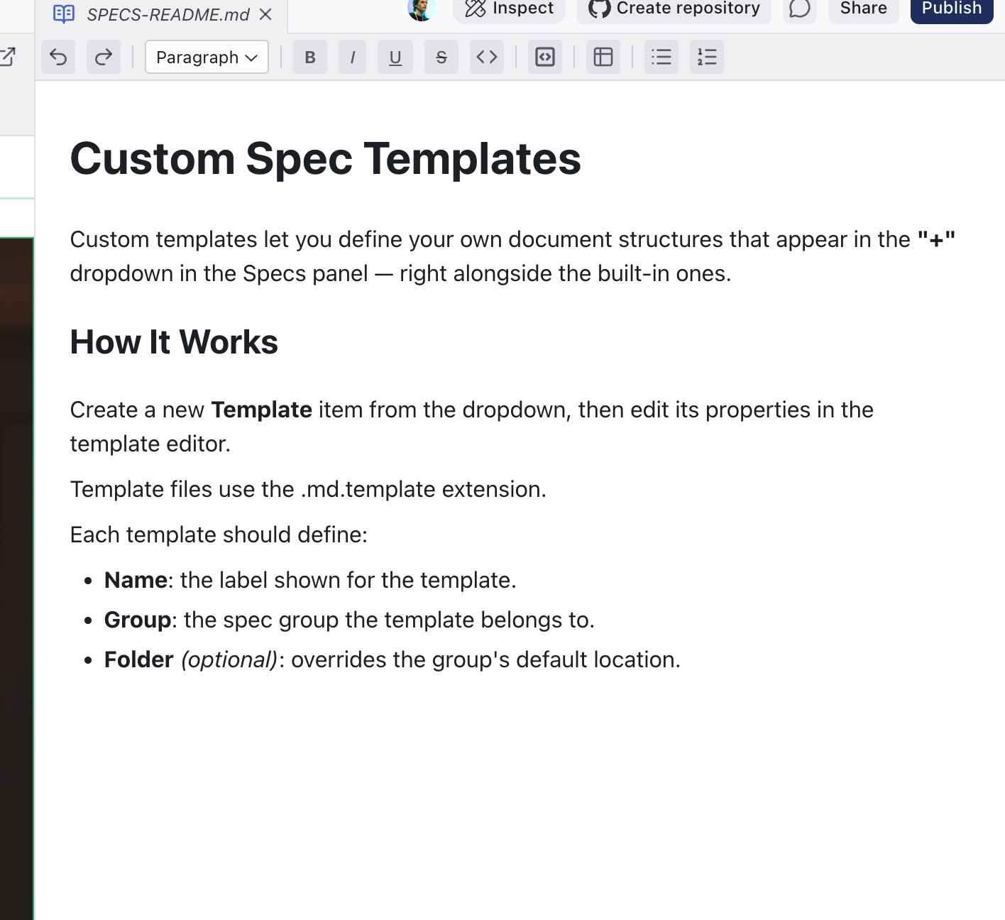 Click a spec file to open it as a tab in the center area. The editor is a WYSIWYG markdown editor with a formatting toolbar: