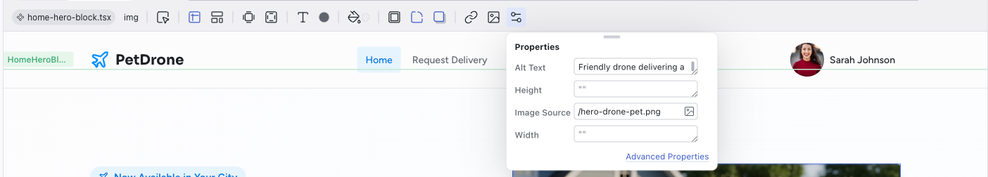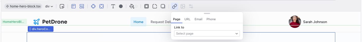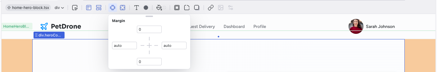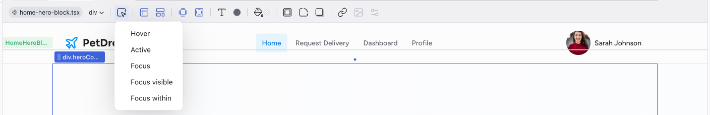 The left side of the toolbar shows the file breadcrumb (e.g., home.tsx) and the component name (e.g., HomeHeroBlock). This tells you exactly which file and component the selected element belongs to.