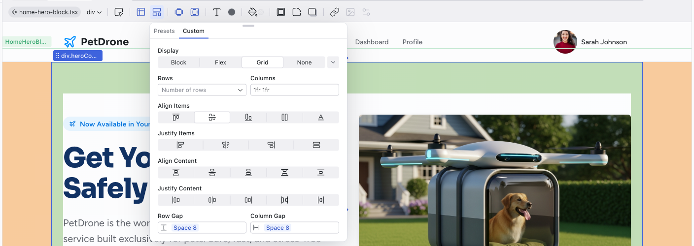 Choose a layout mode for container elements. The Presets tab offers common patterns, while the Custom tab gives you full control over flexbox and grid properties.