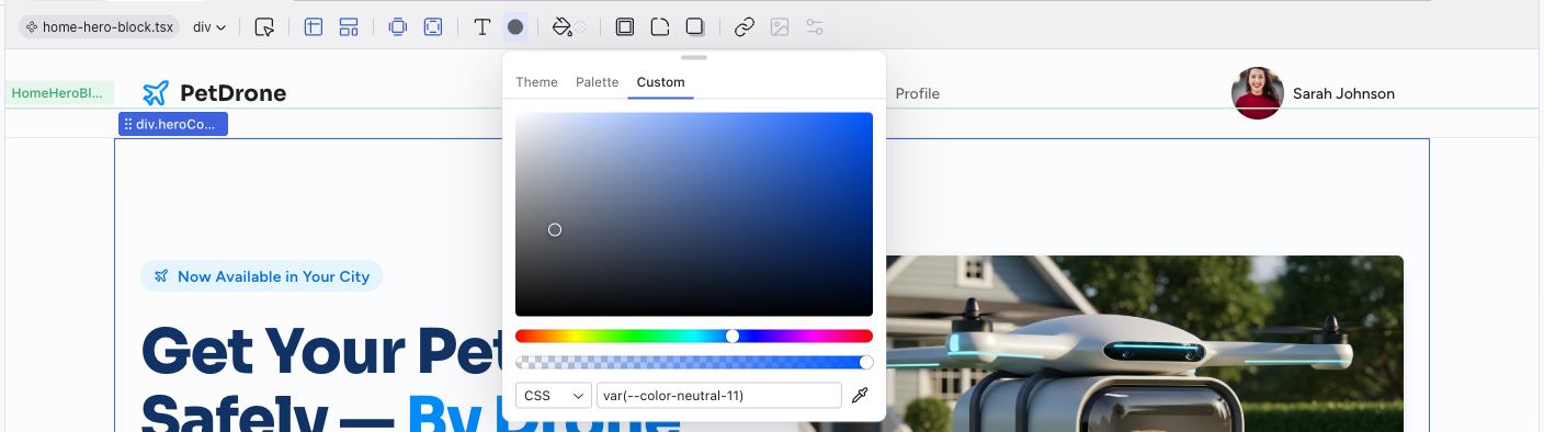 - Breadcrumb label showing the component name (e.g., "HomeHero...")