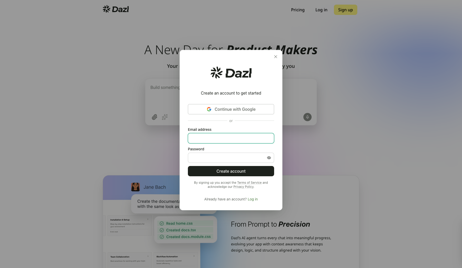 If you already have an account, click Log in on dazl.dev and choose Continue with Google or Log in with your email.