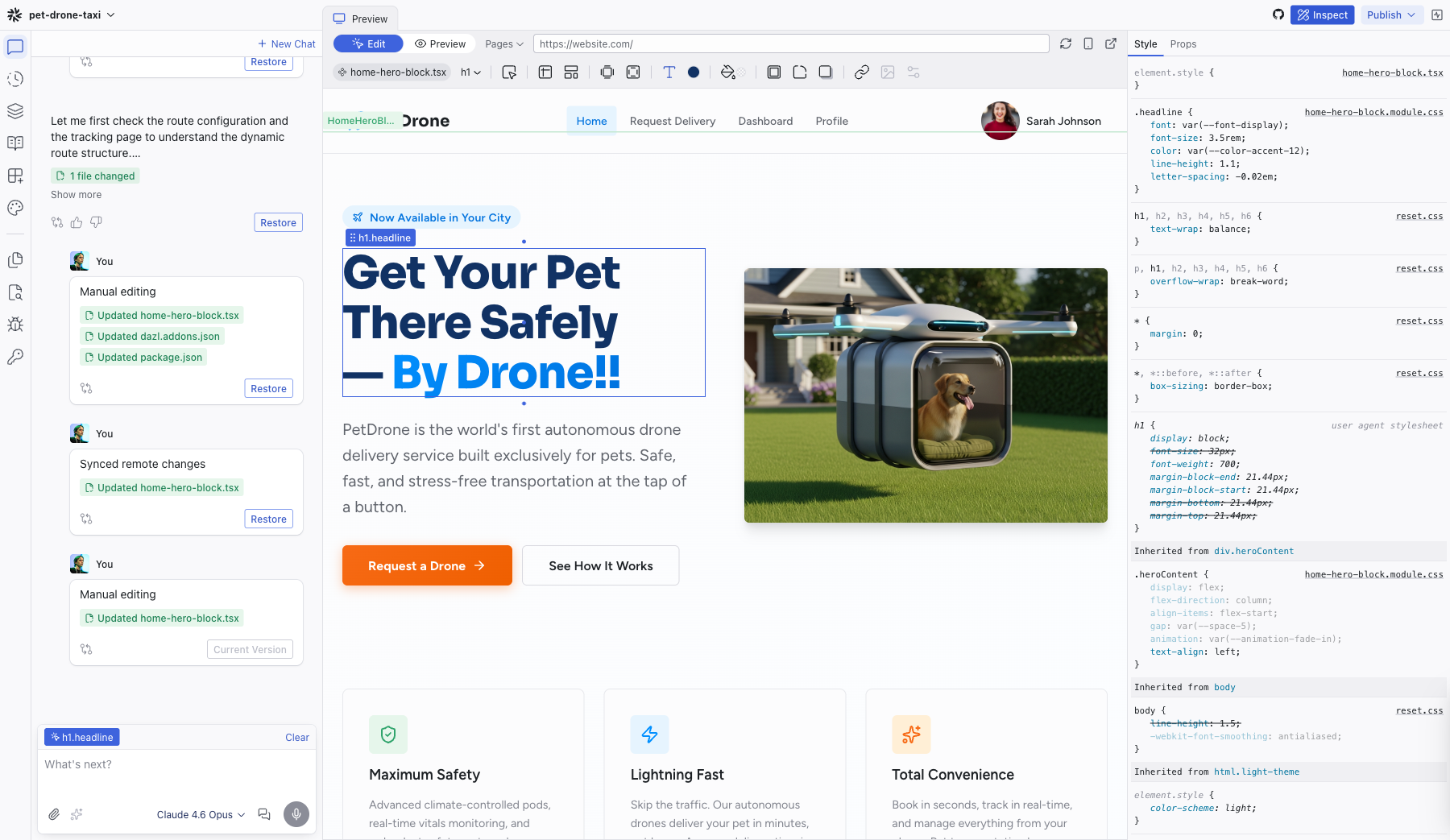 Shape the experience with hands-on visual editing: drag elements, change colors, edit text, and tweak hover states without touching the chat or spending credits. Every visual change immediately updates the underlying code, and every code change updates the visual preview.